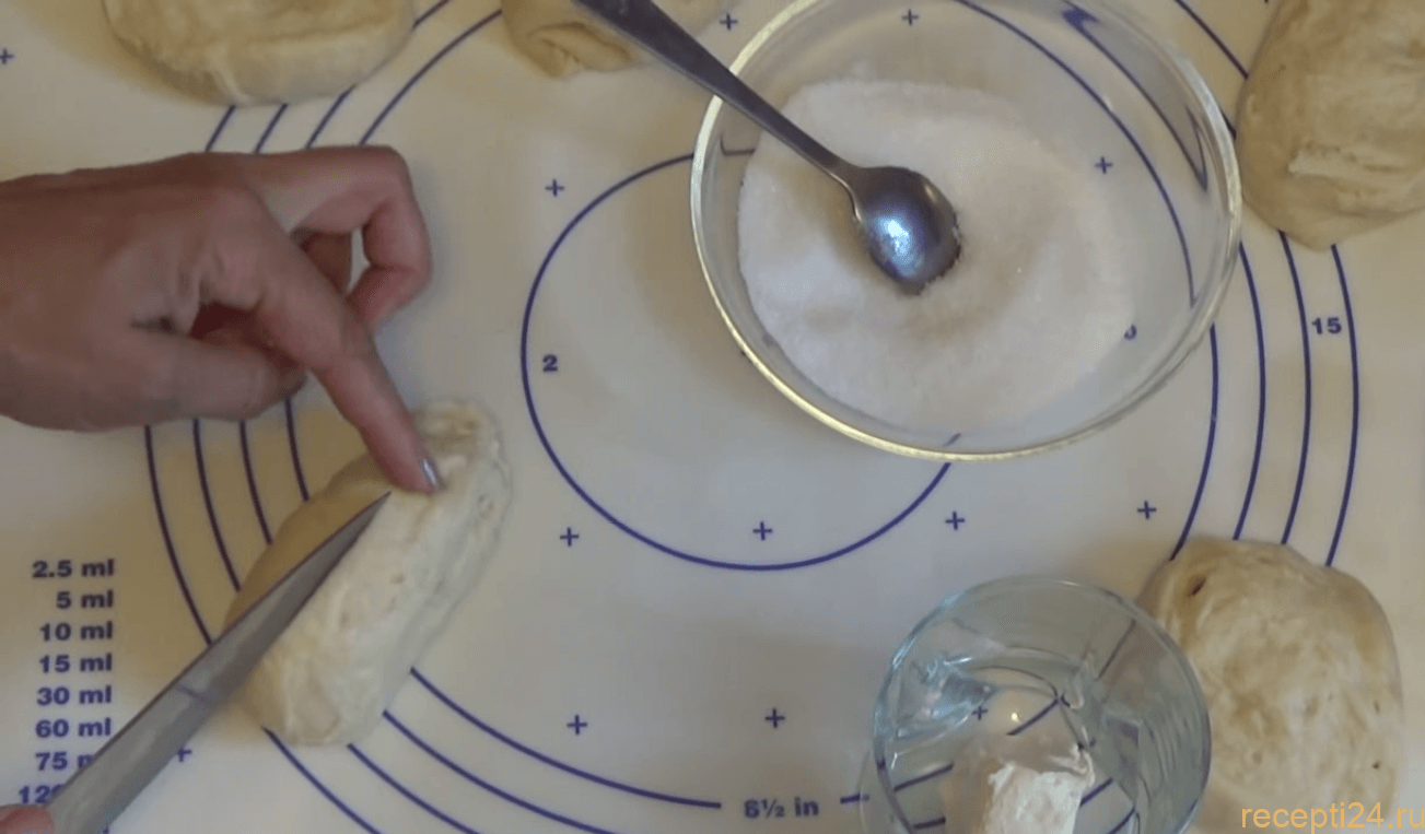 Заверните приготовленные лепешечки с сахаром в рулетики, края следует старательно поджать. После этого слепите концы рулетиков друг с другом. Положите их набок, а затем сделайте надрез ножом.