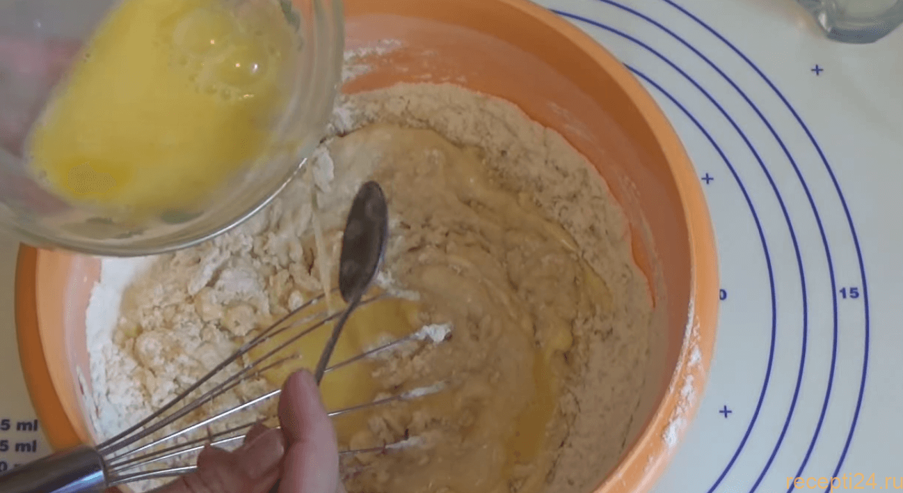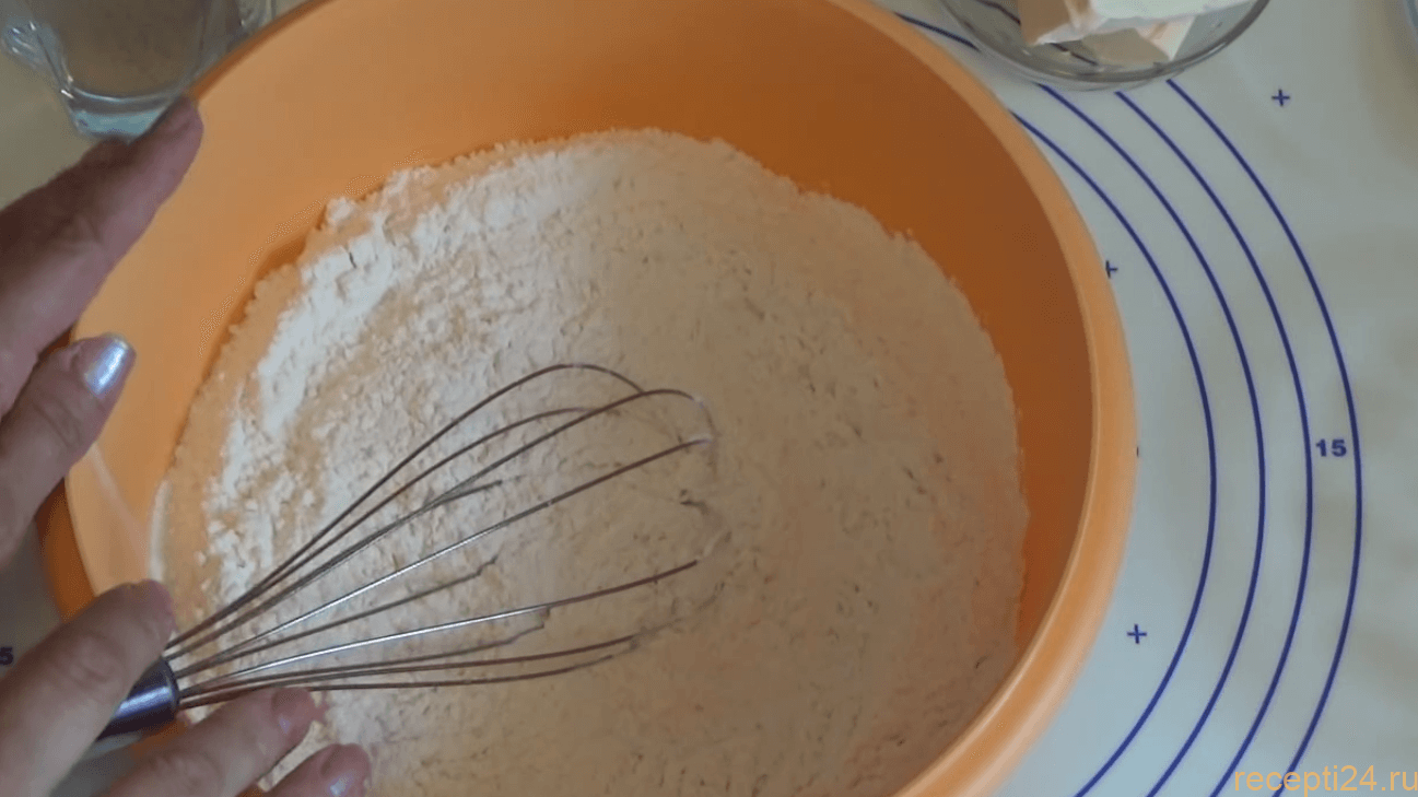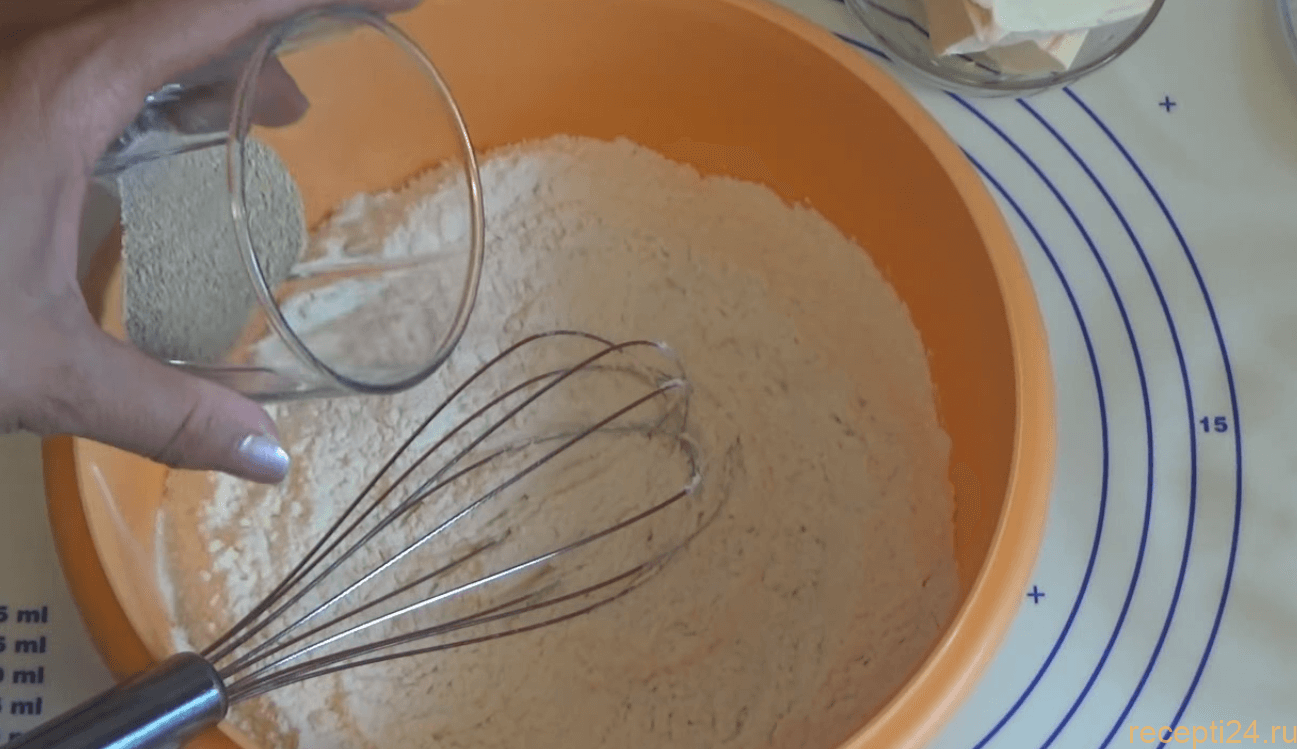 Теперь всыпаем дрожжи в муку и хорошо перемешиваем сухую смесь венчиком.