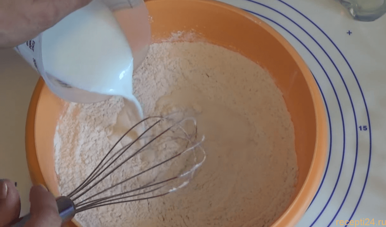 Разогретое молоко смешанное с водой нужно потихоньку влить в муку с дрожжами. Помешивая венчиком у нас замешивается тесто.