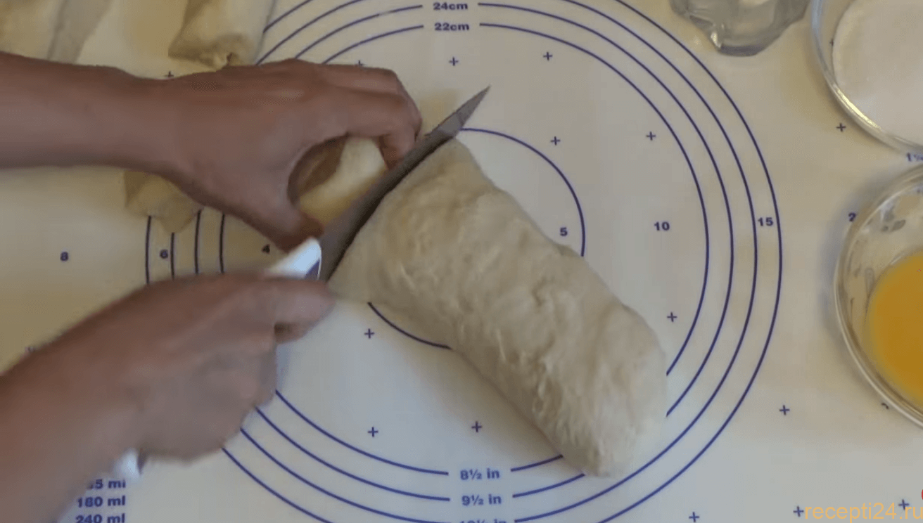 Раскатайте хороший батон теста руками, затем нарежьте его на небольшие части, это и будут в будущем плюшки.