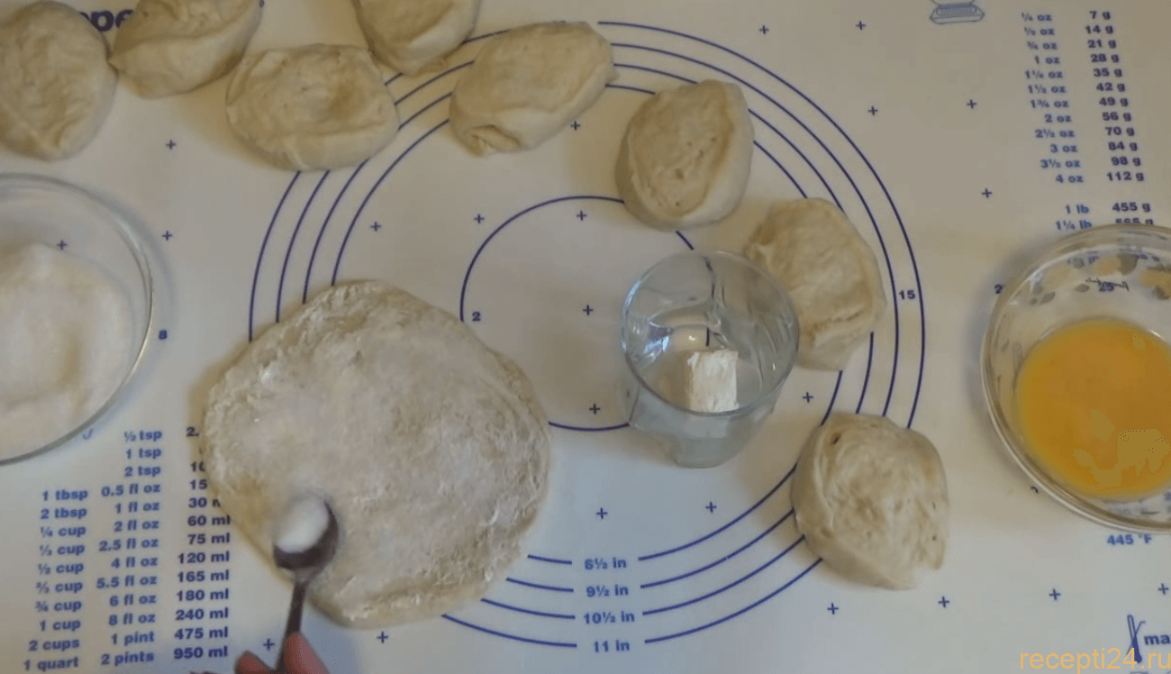 Каждый комочек теста надо размять руками в блинчик, его толщина не должна превышать полсантиметра. Смажьте верхнюю часть теста сливочным растопленным маслом, с этой задачей отлично справляется кисточка. Сверху посыпьте сахаром каждую приготовленную лепешку.