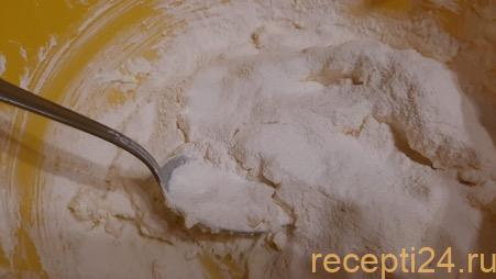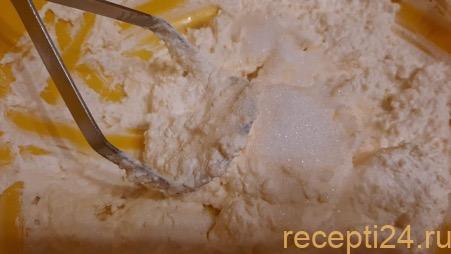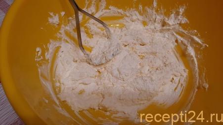 300 г муки нужно предварительно смешать с 1 чайной ложкой разрыхлителя (без горки). Эту смесь добавляем в творожную массу. Подсыпаем постепенно, вымешивая сначала ложкой, а потом рукой.
