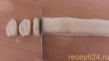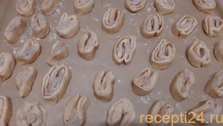 Получившиеся «колбаски» нарезаем на кусочки. Толщина каждой такой заготовки – 1-1,5 см. Они получаются похожими на кривоватые сердечки. Так и должно быть, в процессе выпечки все расправится.