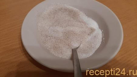 В это время готовим посыпку: 150 г сахара смешиваем с третью чайной ложки корицы и 1 г ванилина. Можно использовать ванильный сахар, или делать без корицы, если вам не нравится ее аромат.