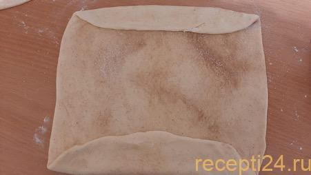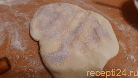 Через час достаем из холодильника кусок теста, раскатываем его в прямоугольник, до сантиметра толщиной, и посыпаем сахаром с корицей и ванилью.