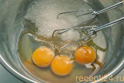 Отсыпать 2 столовые ложки сахара в другую емкость. 150 г сахара, 1 чайную ложку ванильного сахара взбить с яйцами с помощью миксера или блендера.