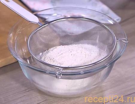 Смешивать отдельно 1 стакан муки с 2 ложками разрыхлителя. Можно использовать кружку для просеивания.