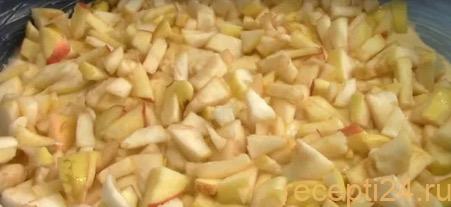 Делим яблоки на 2 части. Одну высыпаем на нижнюю поверхность формы, сверху покрываем тестом, наверх выкладываем оставшуюся часть.
