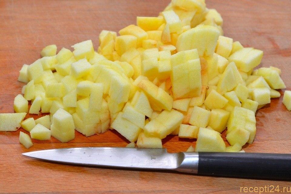 Нарезать мелким кубиком 5 яблок. Добавляем 2 столовые ложки лимонного сока.