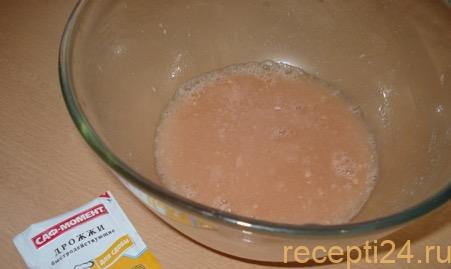 Смешать 1.5 ч. ложки дрожжей с 1 столовой ложкой сахара. Добавить 1.5 стакана теплой воды. Тщательно размешать.