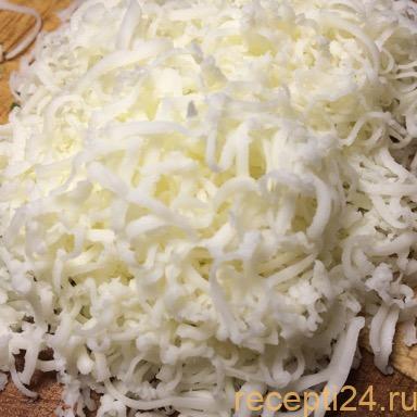 Сыр моцареллу натереть на крупной терке. Он хорошо плавится и равномерно покрывает начинку. Добавлять его в конце не стоит. Начинка во время приготовления может сильно подсушиться и сгореть. Сыр создает защитную пленку.
