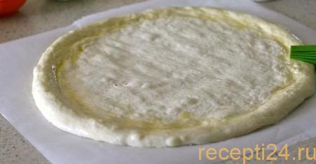 Добавлять муку лучше через сито. Так происходит обогащение кислородом. Тесто хорошо поднимается. Вымешивать его можно с помощью силиконовой лопатки. Тщательно перемешивать каждый ингредиент. Когда будет сложно мешать, продолжать замес вручную. Чтобы руки не прилипали можно смочить их немного подсолнечным маслом. Замешивать лучше на протяжении 15 минут. Хорошо обминать с каждой стороны. Тесто для пиццы готово, если на нем не остаются углубления. Емкость смазывается сливочным маслом, кладется готовый пласт. Сверху накрывается пищевой пленкой или вафельным полотенцем.