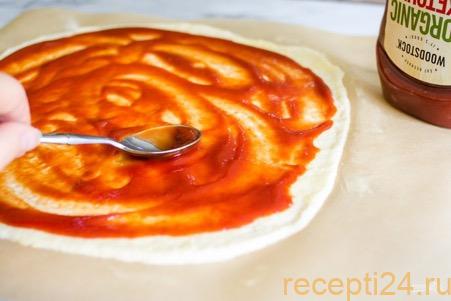 Равномерно распределить томатную пасту или кетчуп ( 4 ст. ложки) по готовому тесту.