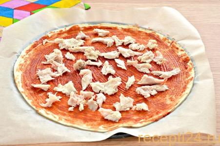Мука должна быть пшеничная высшего сорта. Подойдет сухая колбаса для пиццы с небольшим содержанием жира. Получается сочная начинка. Вместо филе можно использовать куриный окорочок. Сварить его до полной готовности. Нарвать на волокна и добавить в пиццу.