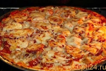 Выпекать в духовке при температуре 200 градусов 20 минут. Пиццу нарезать на кусочки и подать к столу. Блюдо можно есть как горячим, так и холодным.