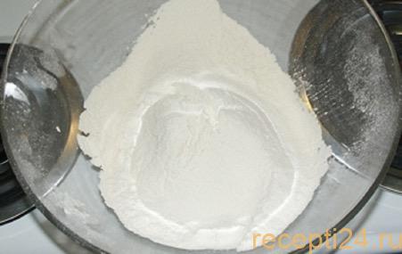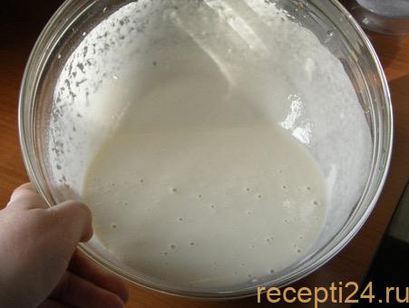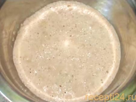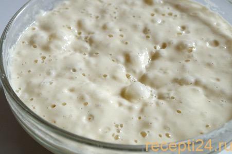 К дрожжевой смеси добавить 5 столовых ложек муки. Замешать опару. По консистенции должна получиться густая сметана.