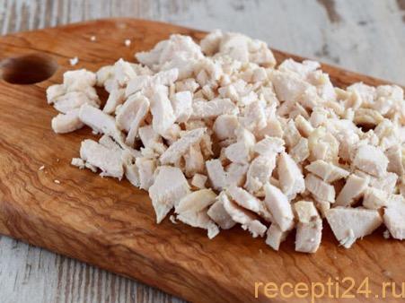 Отваренное куриное филе порезать мелким кубиком или нарвать на волокна.