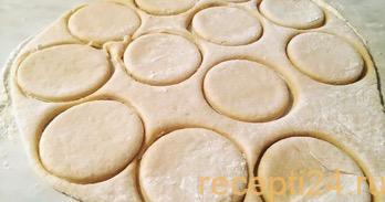 Вынимаем тесто из пакета. Рабочую поверхность и руки присыпаем мукой. При помощи скалки раскатываем тесто до толщины 3-4 мм. Для того, чтобы вырезать одинаковые круглые кусочки можно использовать большие чашки. Остатки теста образуем в новый комок и вновь создаём вырезки круглой формы.