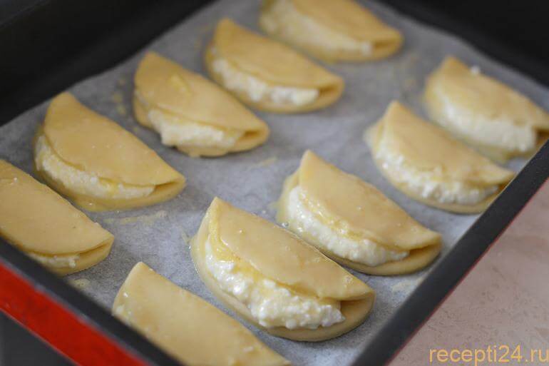 На один кружочек выкладываем немного творога, примерно 1-2 чайные ложки. Складываем пополам, можно наложить тесто так, чтобы часть начинки выглядывало, это придаст большей аппетитности готовому блюду. Либо же создать симметричную конструкцию и примять края вилкой для надёжного скрепления.