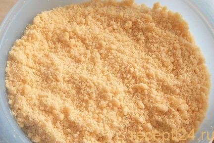 Подготовленное сливочное масло высыпается в миску. К нему добавляется просеянная мука. Все хорошенько растирается. Муку просеивать нужно обязательно. Пирог будет более воздушным, а тесто рассыпчатым. В эту же емкость высыпается стакан сахара, ваниль, гасится сода. И снова все перемешивается. Должна получиться своеобразная крошка.