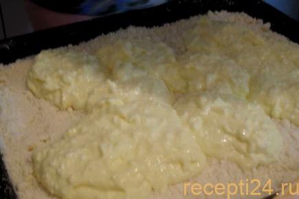 Противень выстилается пергаментом. Его смазывают сливочным маслом. На бумагу сыплется половина крошки (теста). Сверху, по крошке выкладывается творог. Верх ватрушки присыпается оставшейся половиной теста. Противень помещается в разогретую духовку. Выпекать пирог нужно при температуре 180 С.