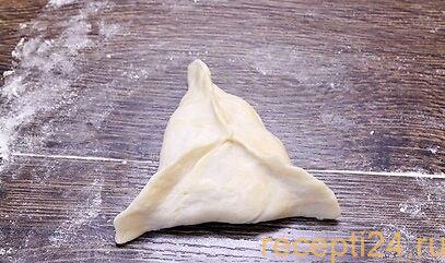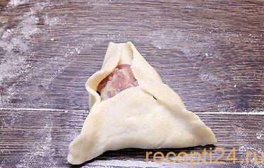 В идеале должен выйти красивый конвертик. Такое же делают с остальными кусочками теста и начинкой. Важно прочно скрепить швы, чтоб они не разошлись в духовке.