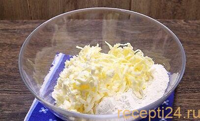 Сначала нужно замесить тесто. Для этого смешивают муку с солью. Масло необходимо предварительно охладить. Так его легче будет натереть на крупной терке. Все ингредиенты тщательно смешивают в глубокой миске.