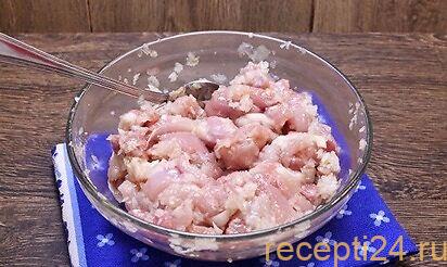 Мясо и овощи соединяют, добавляют соль и перец.