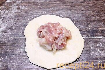 Охлажденное тесто нужно порезать на куски и раскатать в кружочки. Затем его складывают пополам и снова раскатывают. Так нужно сделать минимум три раза. Раскатывать нужно на поверхности, которая хорошо присыпана мукой. Тогда слоеное тесто будет нежным и мягким. В середину теста кладут куриную начинку.