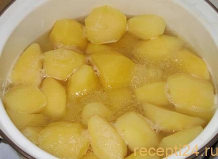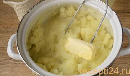 С готового картофеля сливается вода. Его подсаливают по вкусу, добавляют в него 120 г масла. Далее из картофеля делается пюре. В картофель разбивается одно яйцо и добавляется 1 желток. Все тщательно перемешивается.