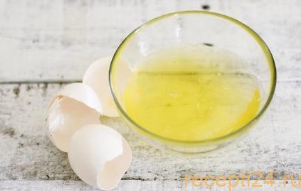 Отдельно в оставшийся белок добавляется 30 г масла, и смесь взбивается венчиком. Эту массу убирают в сторону. Она будет использоваться в качестве помазки. Наносить помазку удобно силиконовой кисточкой.