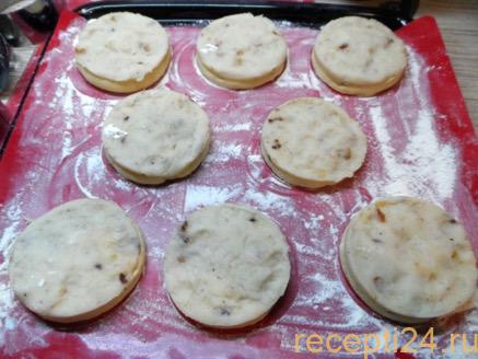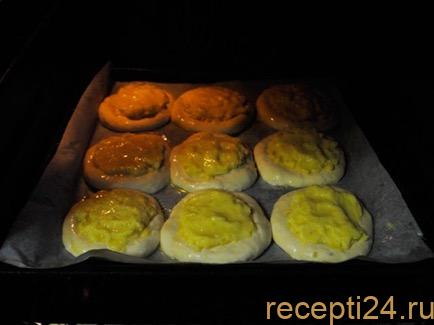 Тесто делится на несколько небольших шариков размеров в половину кулака. Заготовки раскатываются так, чтобы получились небольшие лепешки, толщиной около 2 см (не меньше). Сверху на лепешки укладывается начинка и все смазывается белком с маслом. Так нужно проделать со всеми заготовками. Для красоты можно края немного загнуть вверх, чтобы начинка оказалась немного ниже теста.