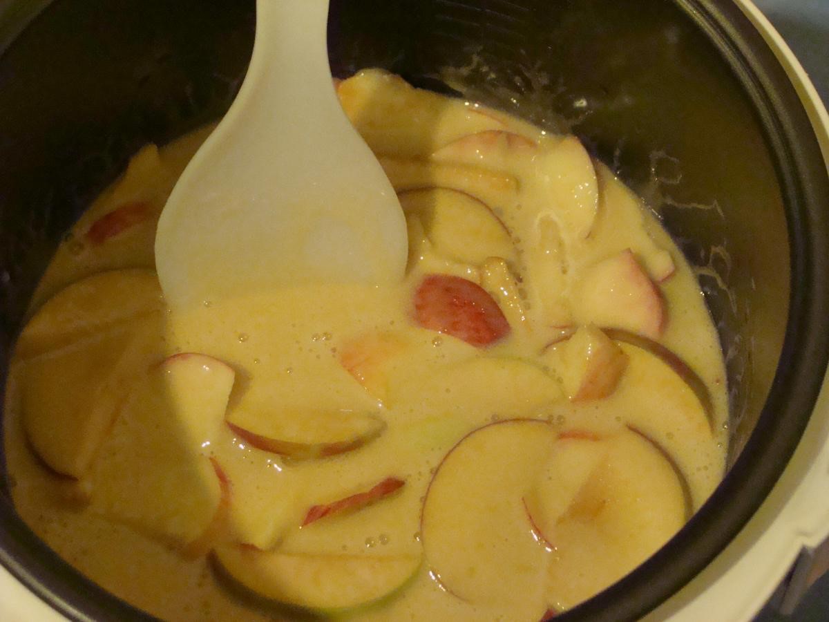 — добавляем яблоки в тесто, тщательно перемешиваем и выкладываем получен-ную смесь в мультиварку, или