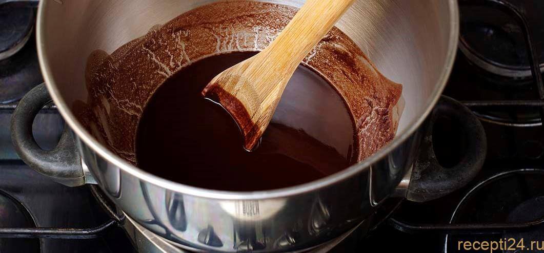 К взбитым желткам аккуратно вводят какао с водой и растопленное масло. Смесь тщательно перемешивается деревянной ложкой.