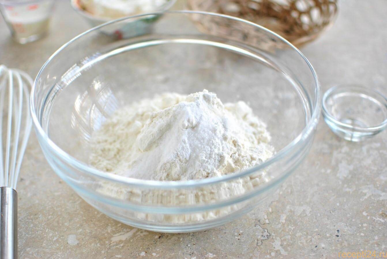 В миске необходимо смешать муку, пекарский порошок, соду. Рекомендуется эти ингредиенты после смешивания несколько раз просеять через сито.