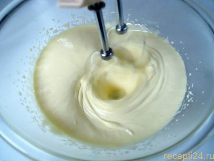 Желтки взбиваются миксером с сахаром. Сахар высыпается почти весь. Некоторую часть его нужно отставить в сторону. Взбивать нужно до тех пор, пока смесь не побелеет и не увеличится в объеме вполовину. Сахар должен полностью раствориться.