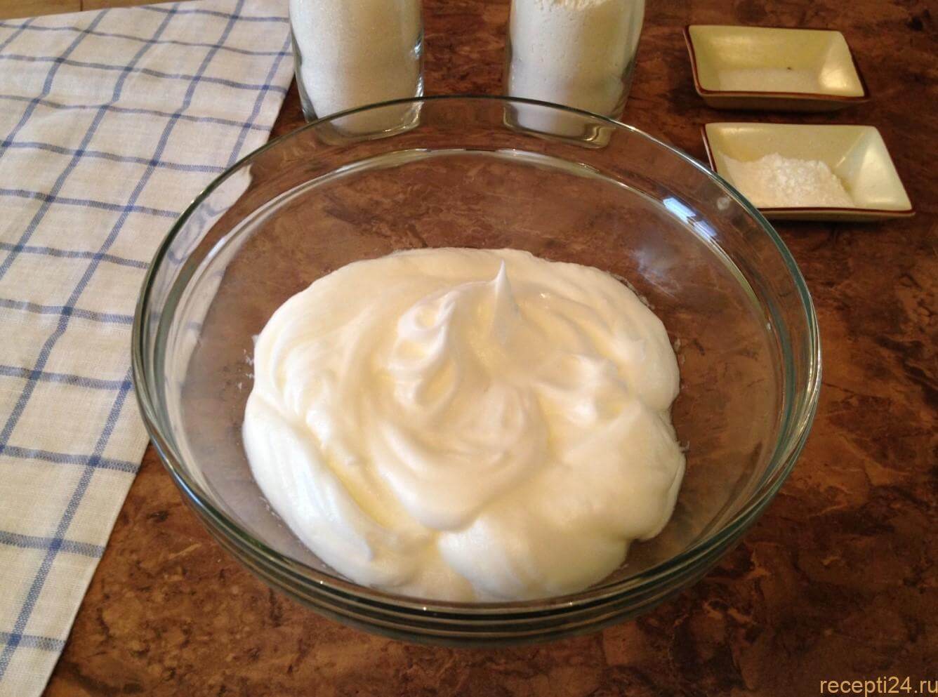В отдельную высокую емкость выливаются белки. Сюда же высыпается щепотка соли и оставшийся сахар. Белки хорошо взбиты тогда, когда с венчика миксера масса ее падает. Белковая пена должна хорошо держать форму.