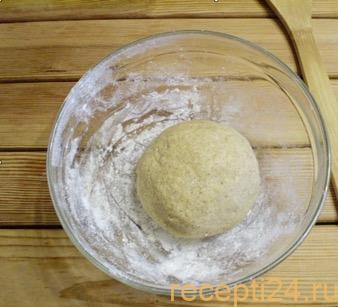Добавить указанное количество муки и замесить тесто. Должен получиться плотный, но мягкий комок.