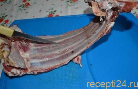 Острым ножом необходимо сделать продольные неглубокие надрезы вдоль косточки. Кусок баранины должен остаться целым.