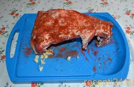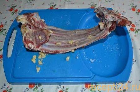 В прорези вставляем небольшие кусочки чеснока. Если не нравится шпигованное мясо, можно просто измельчить чеснок и натереть им баранину.