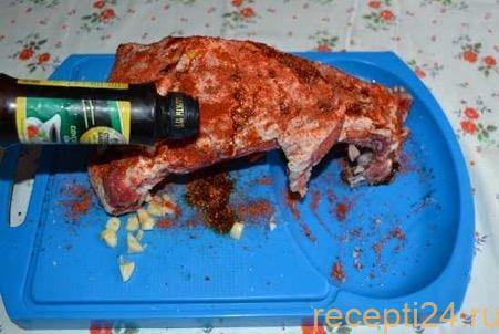 Сверху натертые ребра нужно полить 1 столовой ложкой соевого соуса. Оставляем мясо промариноваться в холодильнике на 1 час.