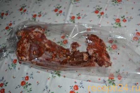 Достаем баранину из холодильника и заворачиваем в пакет для запекания, плотно затянув его концы.