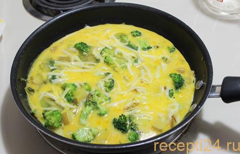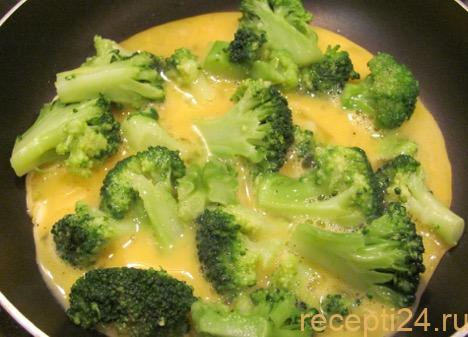 Взбивают яйца со сливками, солью и черным перцем и заливают в сковородку с брокколи.