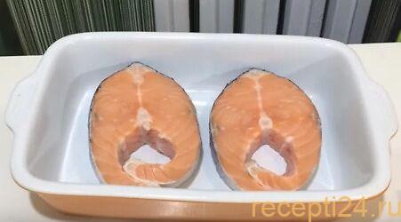 Первым делом нужно выложить рыбу в форму для запекания.