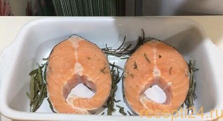 Запекают рыбу 15 минут при 2200 градусах. Затем на 5 минут снимают фольгу и доводят блюдо до полной готовности.