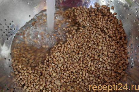 Перебрать и промыть гречневую крупу. Слегка обсушить, откинув на сито.