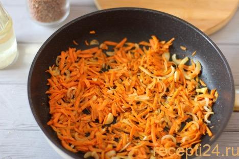 На сковороде с толстым дном и стенками обжарить морковку с луком, как на зажарку для супа.