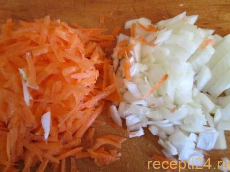 Почистить и нашинковать овощи. Лук мелко порезать, морковь натереть на крупной терке.