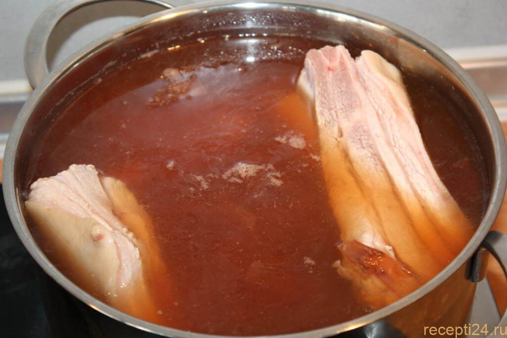 Понять готовность грудинки можно по ароматному запаху. Варёную свинину накрываем шелухой так, чтобы она равномерно окрасилась. Оставляем мясо, пока оно не станет холодным. В прохладное место его перемещать не нужно, лучше кастрюлю оставить на плите.