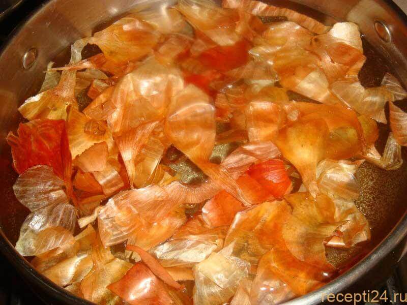 - Лучше использовать тёмную кастрюлю, так как шелуха окрашивает поверхность изнутри, и отмыть краситель не так-то просто.